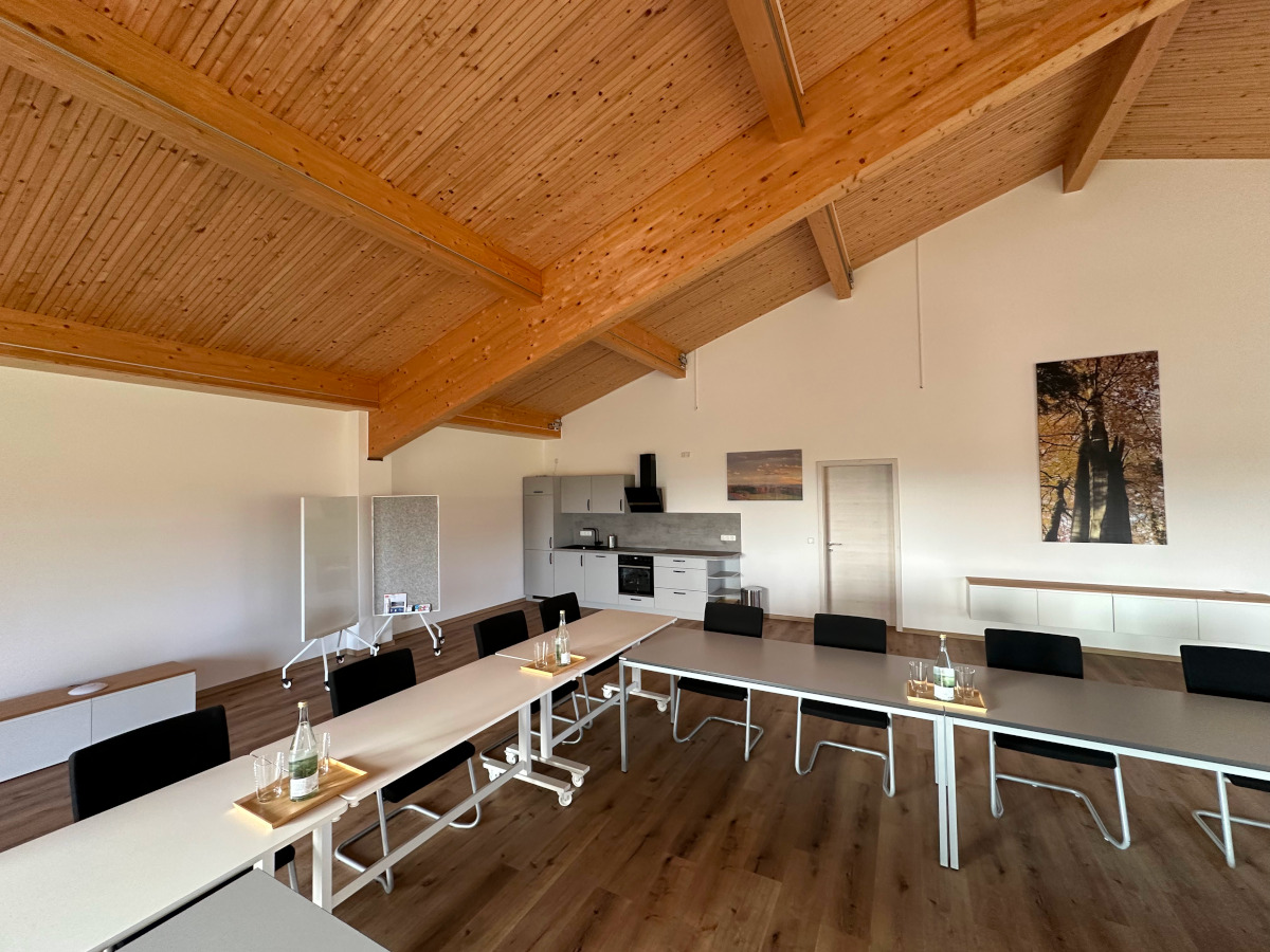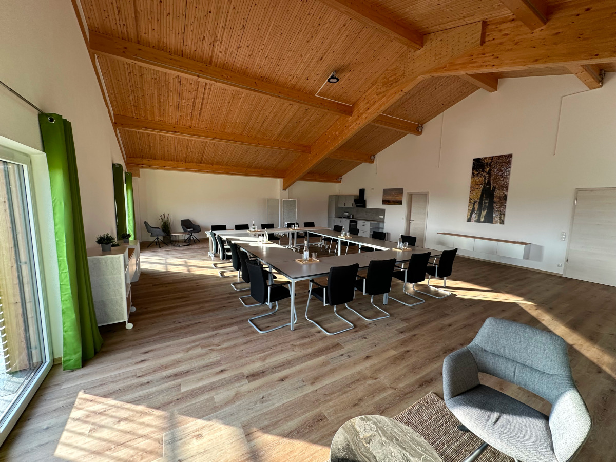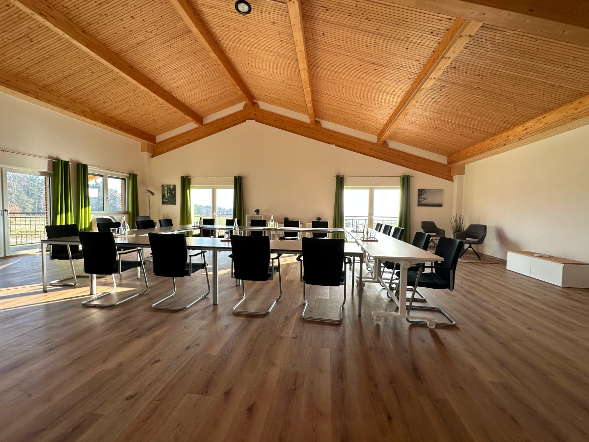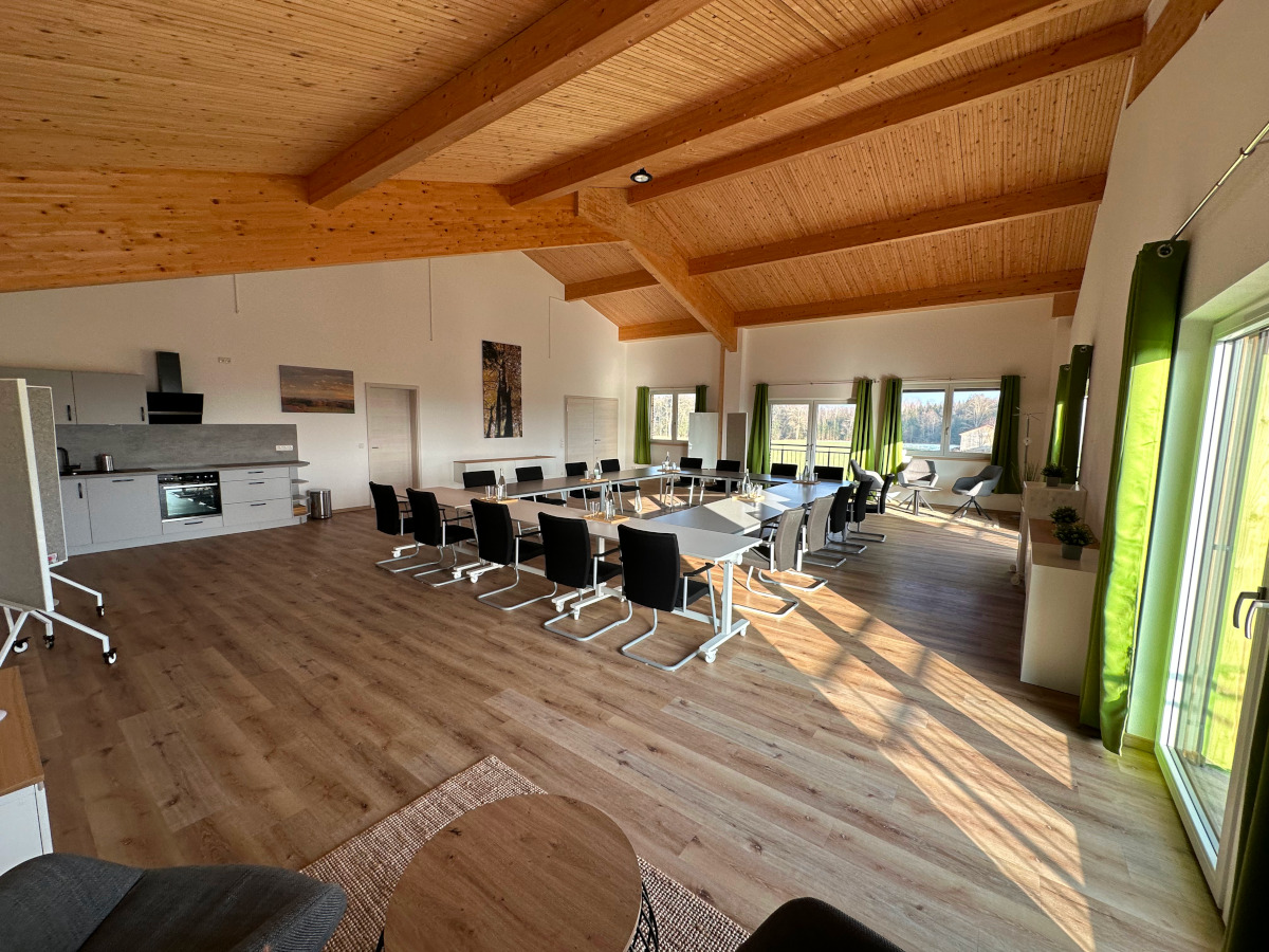Die ruhige, naturnahe Umgebung sowie die großzügigen Räumlichkeiten schaffen ideale Bedingungen für fokussiertes Arbeiten und kreatives Denken. Unser Seminarraum ist flexibel nutzbar und eignet sich hervorragend für Seminare, Workshops oder Fortbildungen – alles in einer entspannten und professionellen Atmosphäre.